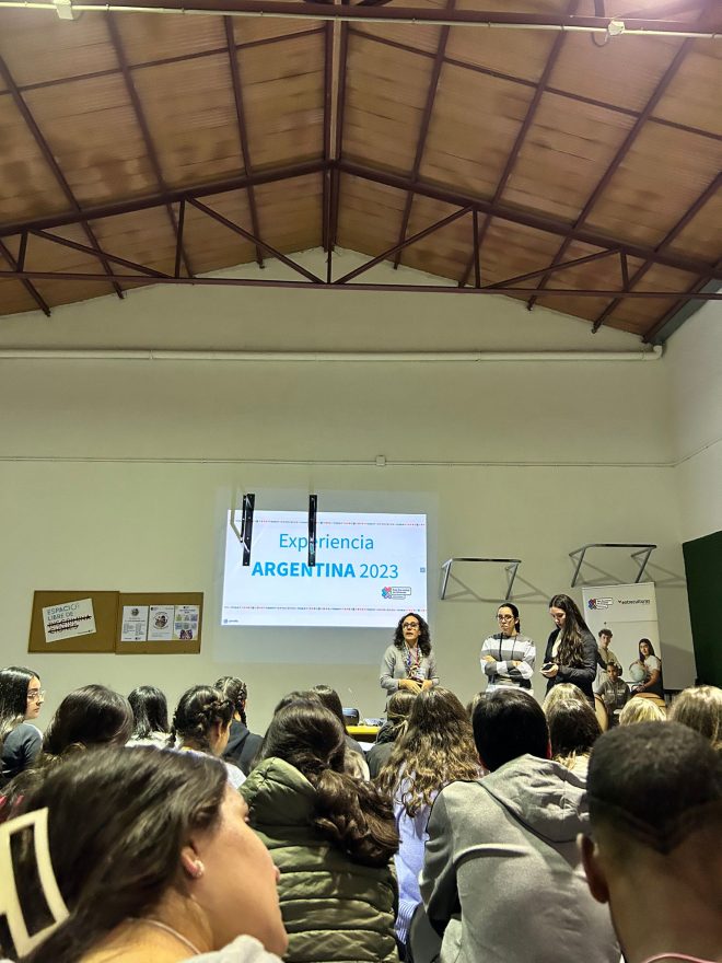 Por la noche, disfrutamos de un viaje desde Villafranca de los Barros hasta Salta, donde Marta, Laura y Fátima nos contaron lo que supuso el Intercambio internacional con la Red Generación 21+ de Argentina. Nos contaron lo que les llevó esa experiencia, lo que dejaron en sus corazones y las ideas y propuestas que se les ocurrieron durante y después de la experiencia. También, un pedazo de Argentina viajó hasta Extremadura en forma de dulce de leche, que todo el mundo pudo degustar al son de unas chacareras. Por último, más de 90 aviones de papel viajaron hasta Argentina con nuestros compromisos de este curso con nuestra RSJ.