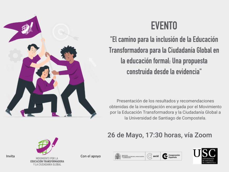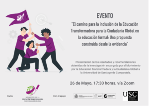 Con mucho entusiasmo os invitamos al evento «El camino para la inclusión de la Educación Transformadora para la Ciudadanía Global en la educación formal: una propuesta construida desde la evidencia» en el que presentaremos los resultados y recomendaciones obtenidas de la investigación encargada por el Movimiento por la Educación Transformadora para la Ciudadanía Global a la Universidad de Santiago de Compostela sobre el estado de la incorporación de la Educación para la Ciudadanía en diferentes niveles del sistema educativo formal en España.