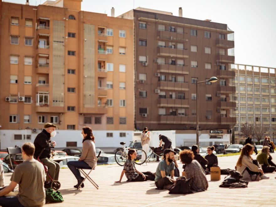 «Mirémonos» es una propuesta del fotógrafo José Bravo que nos invita a volver a mirarnos y conectar con las personas que nos rodean. La acción se llevó a cabo en la explanada de Ayora, un lugar de paso y de reunión de vecinos y vecinas, que dio lugar a dialogar con el barrio y sus habitantes. En ella participaron una veintena de personas que se abrieron a mirar a los ojos de otras personas conocidas y desconocidas. Al finalizar pudimos compartir cómo había sido la experiencia para cada una, destacando esa apertura a la vulnerabilidad del otro y de una misma y la conexión desde la mirada sin necesidad de la palabra. ¡Una experiencia transformadora!