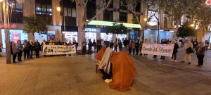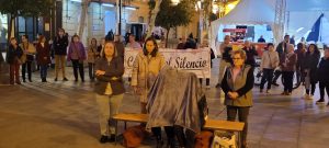 Durante la lectura del manifiesto hicimos un gesto en el centro del Círculo. La representación de tres mujeres y una niña sentadas en un banco tapadas, invisibilizadas. Conforme se leían las peticiones, que manifestábamos al gobierno español y demás autoridades implicadas, se iban destapando una a una las mujeres.